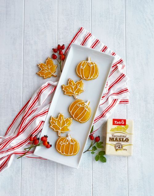Ingredience: 150 g dýňového pyré, 100 g farmářského másla Tatra, 120 g cukru (třtinového nebo bílého), 1 lžička sody, 100 g medu, 1 vejce, 2 perníkového koření, 400 g hladké mouky, bílková poleva na ozdobu