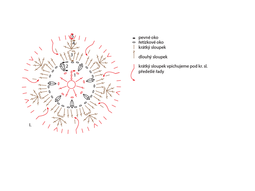 I. základní květinový vzor – háčkujeme podle rozkresu 1. – 5. řadu