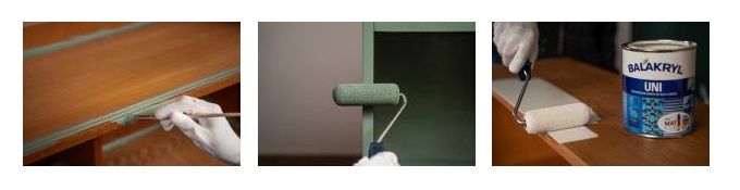Pokud jste se rozhodli pro kombinaci barev, rozdělte si komodu pomocí papírové maskovací pásky na dvě části. Krycí barvu Balakryl UNI důkladně promíchejte a nanášejte ji ve dvou vrstvách s rozestupem 2 hodin. Nátěr výborně kryje, nezapáchá, rychle schne a vytváří krásně matný vzhled. Na větší plochy použijte lakovací váleček. Na hrany, rohy a hůře dostupná místa zase skvěle poslouží tenký štětec typu „zapanty“ nebo zárohový štětec.